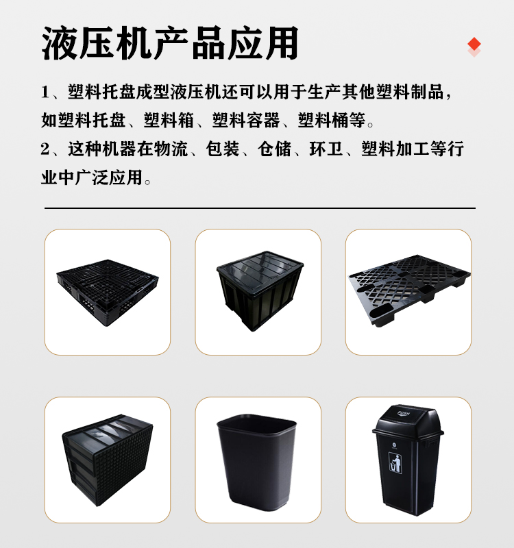 塑料托盤成型液壓機在物流、倉儲、包裝等行業中有著廣泛的應用。塑料托盤是一種常用的物流包裝工具,可以用于存放、運輸和堆放貨物,提高物流效率,降低勞動強度。塑料托盤成型液壓機生產的塑料托盤具有質量穩定、耐用、環保等優點,能夠滿足不同行業的需求。在電子、汽車、食品、化工等行業中,塑料托盤都是必不可少的物流包裝工具,因此塑料托盤成型液壓機在這些行業中具有重要的應用價值。