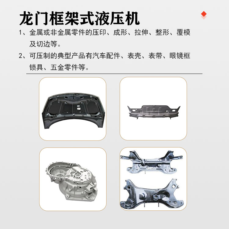 【產(chǎn)品描述】:30噸龍門(mén)框架式液壓機(jī)是一種高效、精準(zhǔn)的壓力成型設(shè)備,廣泛應(yīng)用于各種金屬、非金屬材料的壓制、成型和校正工藝中。其獨(dú)特的龍門(mén)框架設(shè)計(jì)和強(qiáng)大的液壓驅(qū)動(dòng)系統(tǒng),使其具有出色的穩(wěn)定性和工作效率,成為現(xiàn)代工業(yè)生產(chǎn)中不可或缺的重要設(shè)備。 30噸龍門(mén)框架式液壓機(jī)采用高強(qiáng)度鋼材構(gòu)建龍門(mén)式框架,保證了設(shè)備的穩(wěn)固性和剛性。機(jī)身采用優(yōu)質(zhì)鋼板焊接而成,經(jīng)過(guò)精細(xì)的熱處