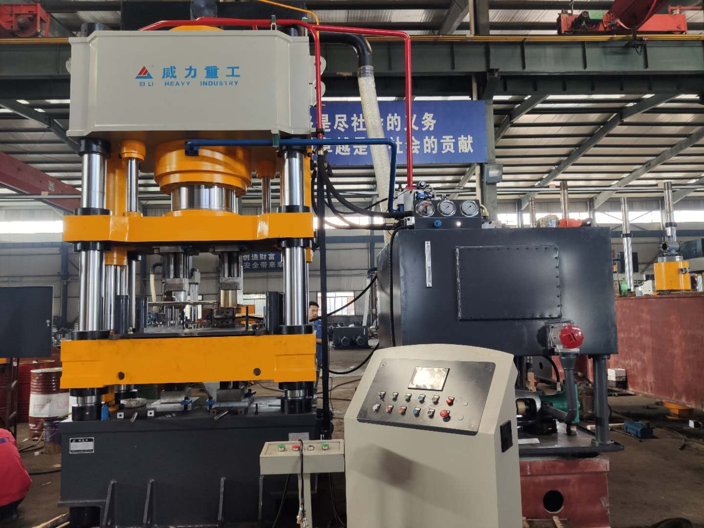 四梁四柱粉末壓塊液壓機(jī)采用四柱式框架結(jié)構(gòu),由上橫梁、下橫梁、四個(gè)立柱和工作臺(tái)組成。設(shè)備整體結(jié)構(gòu)緊湊、穩(wěn)定,具有良好的剛性和承載能力。上橫梁設(shè)有液壓缸,通過(guò)傳動(dòng)機(jī)構(gòu)驅(qū)動(dòng)滑塊進(jìn)行上下往復(fù)運(yùn)動(dòng),實(shí)現(xiàn)對(duì)粉末的壓制成型。工作臺(tái)設(shè)有頂出機(jī)構(gòu),方便脫模和取料。此外,設(shè)備還配備了電氣控制系統(tǒng)和安全保護(hù)裝置,確保設(shè)備的安全可靠運(yùn)行。